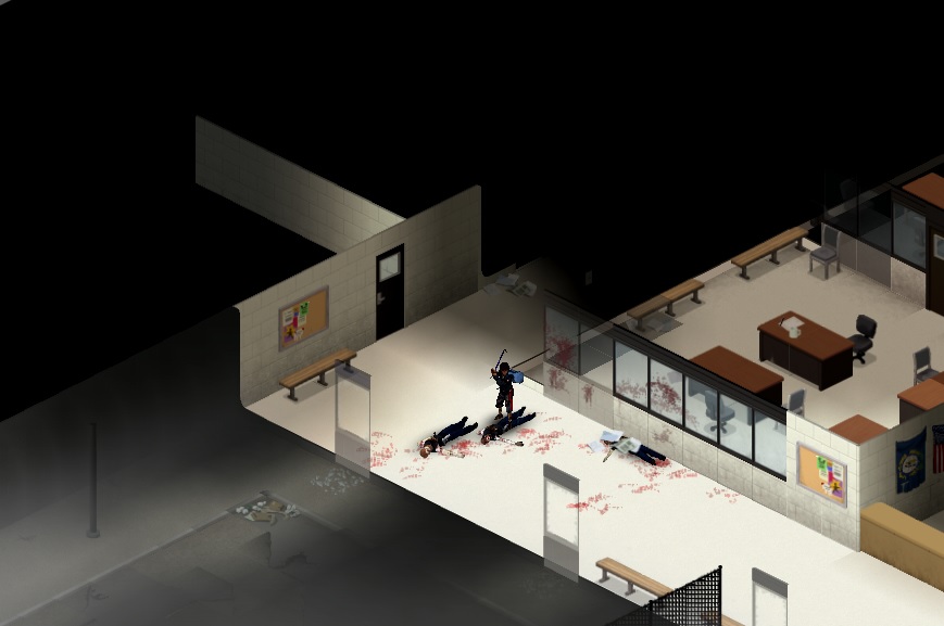 경찰들 아이템의 꽃은 진압봉과 바로 경찰 재킷, 그리고 방탄조끼.. 이 3가지만 있으면 전투력과 생존력이 월등히 높아진다. 진압봉 3개만 주소서.. 일단 옆으로 진입하는게 좋아서 입구를 지키는 경찰관을 때려눕혔다. (방탄조끼와 진압봉을 획득하였습니다!)