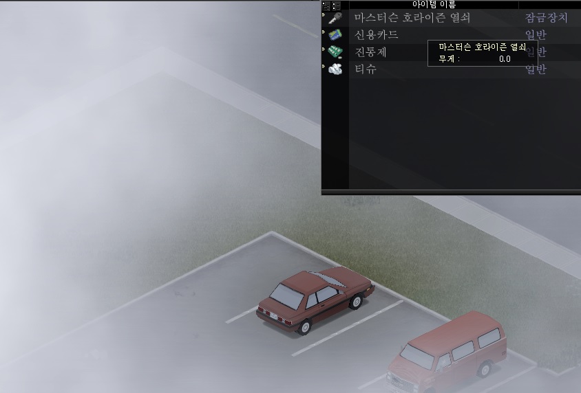 좀비 무리를 피해서 가려던 중에... 그 중간에 키가 떨어진걸 발견했다. 안개 때문인지 좀비들을 유인하는게 쉽지 않았다. 괜히 소리쳤다간 다른 좀비까지 끌고 올것 같아서 일단 주변을 돌면서 애들을 불러 모으고 주웠다. 하지만 어느 차인지 모르겠다. 일단 키만 들고 탈출. 더 돌다간 좀비 밥이 될 것 같았다.