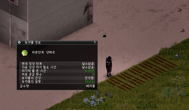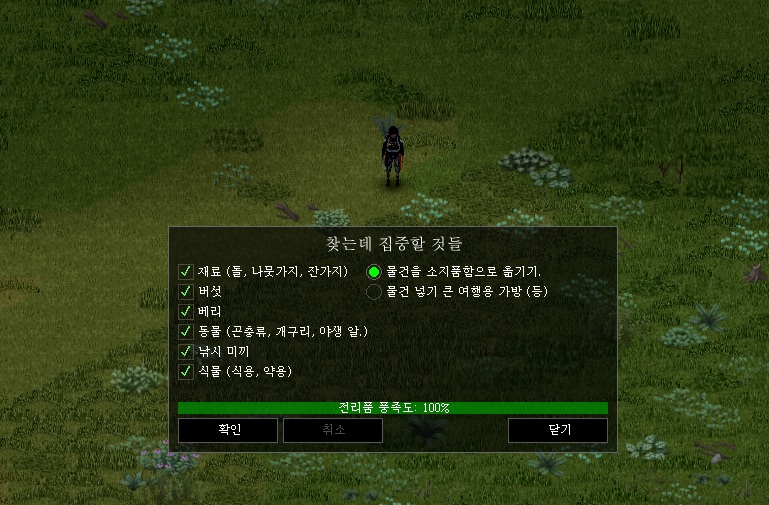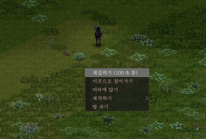 채집도 병행해야 된다. 채집은 한곳에서 계속 팔 수 있는게 아니고 특정 구역에서 채집을 하고나면 하루동안은 더이상 채집을 못한다. 그러니 계속 움직여야 된다. 게다가 채집이 가능한 지역은 도로에서 제법 떨어진 곳에서만 가능하다. 모종삽을 소지하고 있다면 땅에 우클릭시 '채집하기'란게 뜨면 채집이 가능한 곳이다. 옆에 100%는 수집할 수 있는 양인데, 채집하기 눌러서 오른쪽 그림처럼 채집할 것을 정하고 채집을 하기 시작하면, 채집품이 들어오면서 퍼센트가 줄어들게 되고 0%가 되면 다른 지역으로 이동해야 된다. 하여튼 하루에 한번씩 할 수 있으니 부지런히 하자. 베리 종류가 나오는데 그 중에 하나는 랜덤하게 독이 들어있다. 약초학이 있거나 관련책을 읽었다면 어느게 독인지 알 수 있다. 신선한 독이 있는 베리라고 뜨니깐.