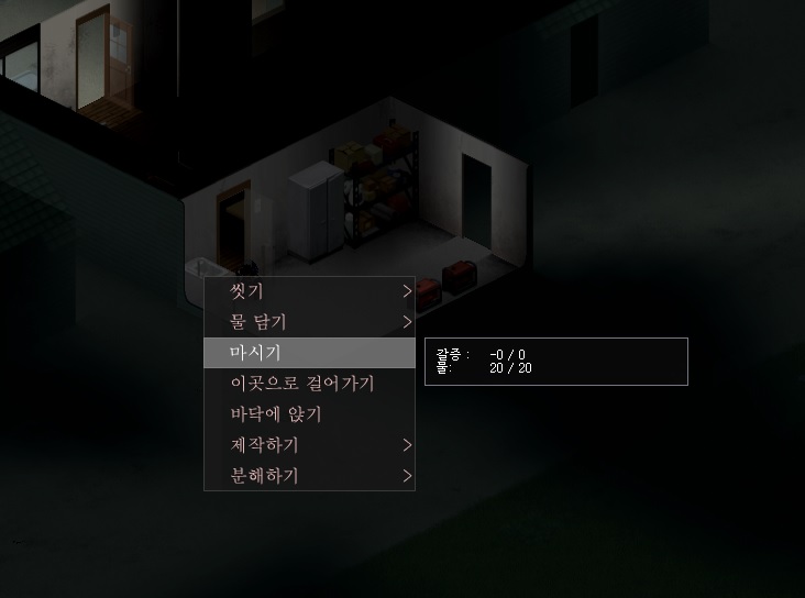 개수대에 가서 물을 마시기 해보면 물 20/20 이라고 제한이 생긴다. 단수 되기 전에는 '제한 없음'이라고 뜨지만 단수가 되면 이렇게 제한이 생긴다. 이걸 다 마시고 나면 이제 더이상 물은 안 나온다.