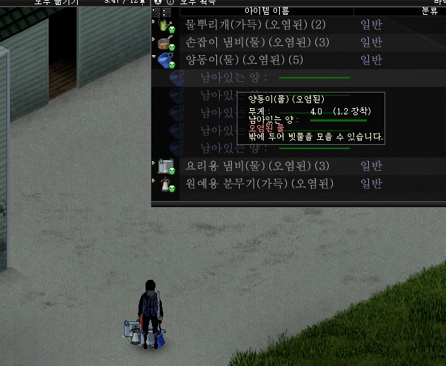 목공레벨이 4, 7이 되면 빗물받이 통을 만들 수 있다. 아직 레벨이 안되다보니 못 만들어서 일단 급한데 위 아이템들을 바닥에 내려놓으면 비가 올때 빗물을 받게 된다. 아니면 호수나 강에가서 직접 떠와도 된다. (원예용 분무기는 바닥에 놔둬도 물이 안찬다. 그냥 채워놓고 버려둔거다)