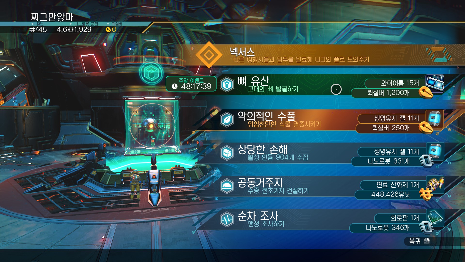 가장 빨리 고대 뼈 행성을 찾기 위해 넥서스에서 퀘스트를 받자. 뼈 유산이라고, 퀵 실버를 1200개나 주는 퀘가 떴다.