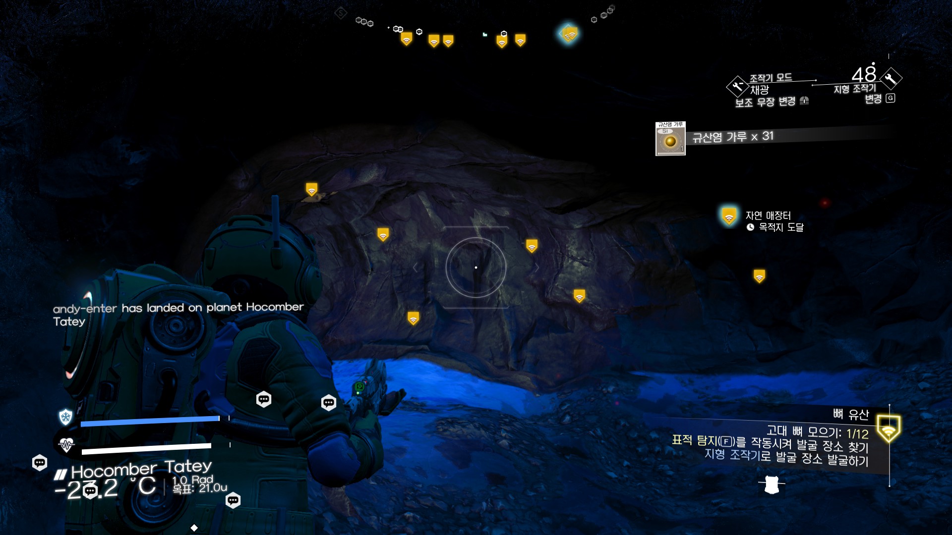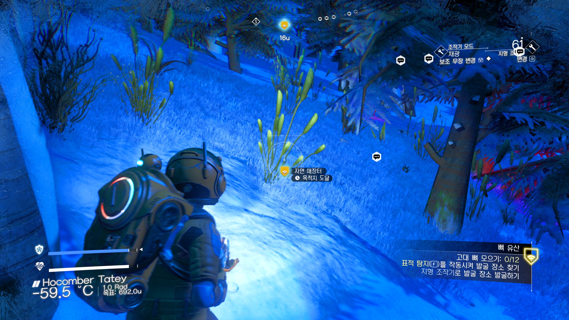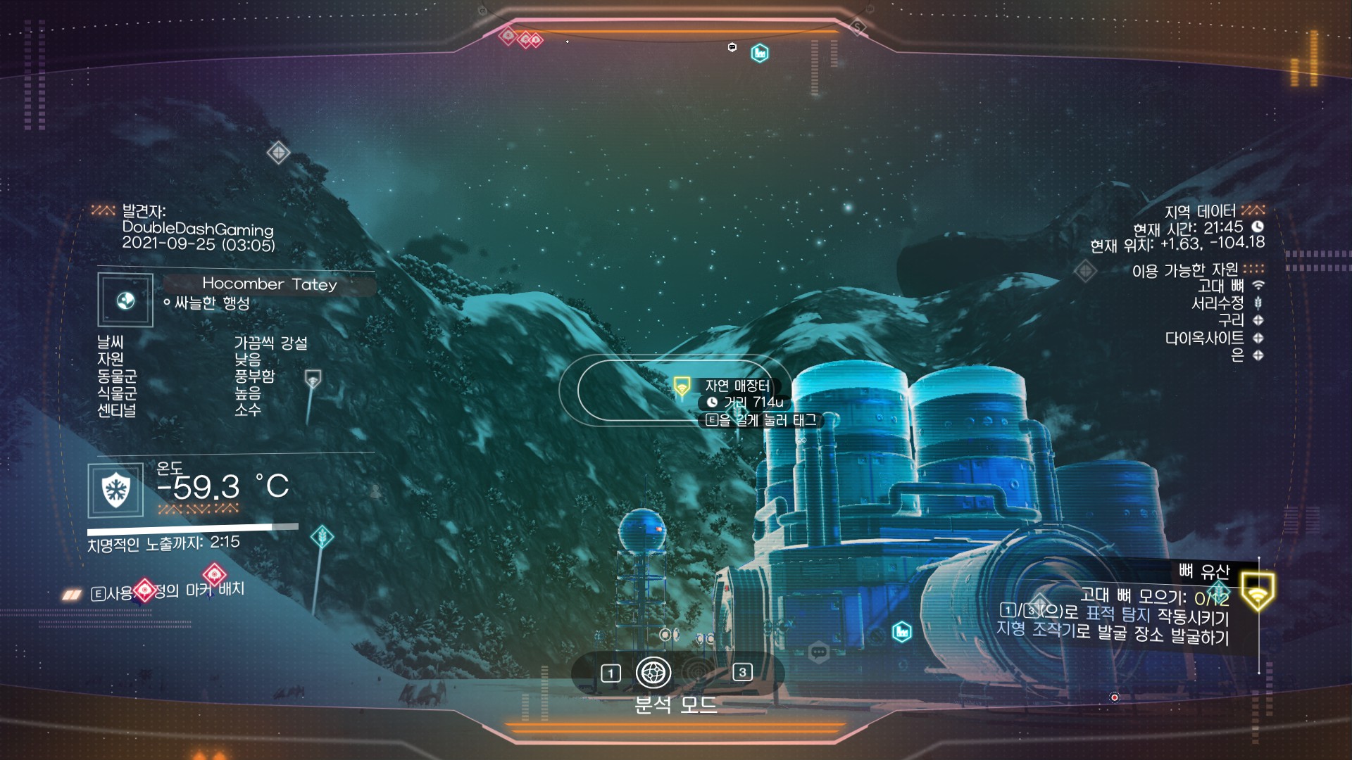 임무를 받은 경우 표적 탐지 모드로 대략적인 위치를 파악 할 수 있지만 임무가 없는 경우는 분석 모드로 해서 들여다 봐야 된다. 그러면 '자연 매장터'라는걸 찾게 된다. 다시 저리로 날라가자.