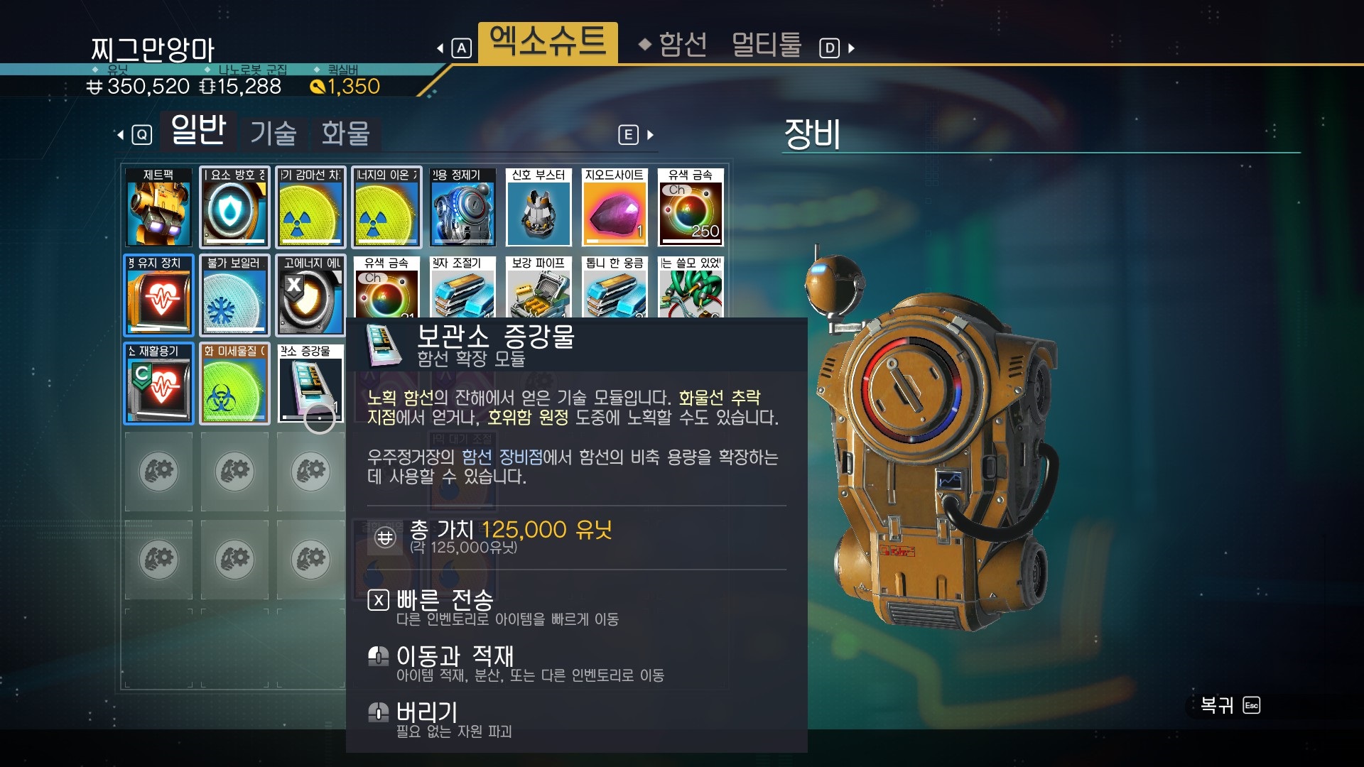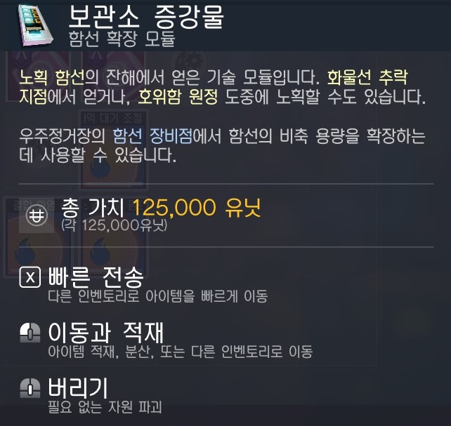이렇게 보관소 증강물과 함선 관련 모듈, 잡다한 아이템을 얻을 수 있다.