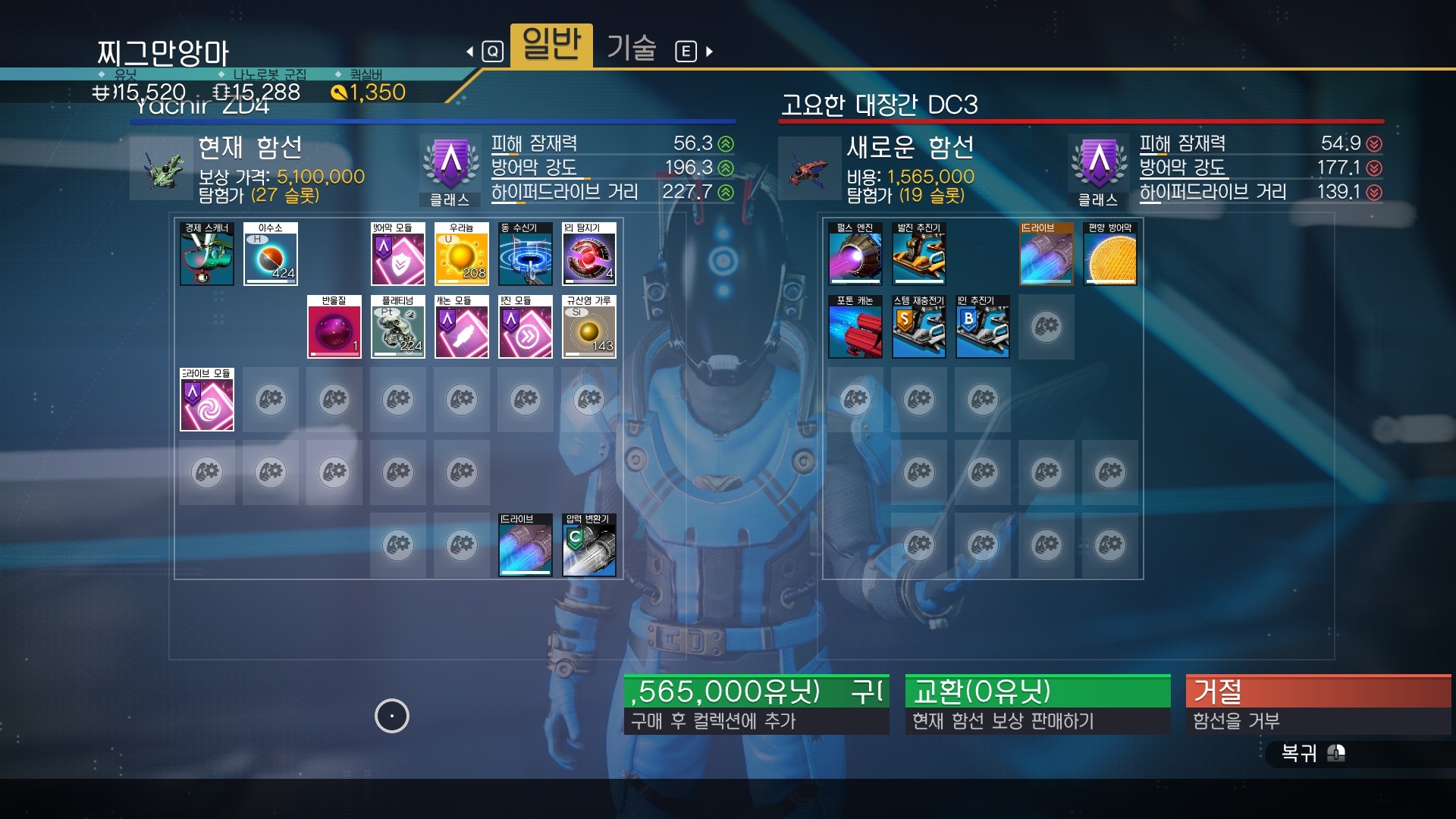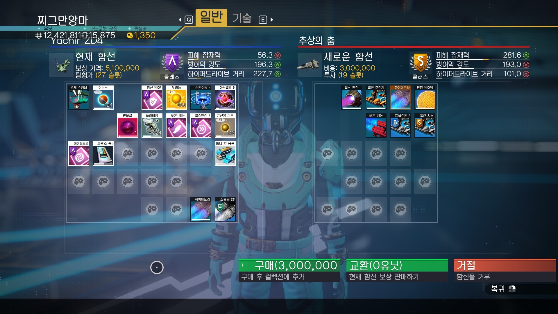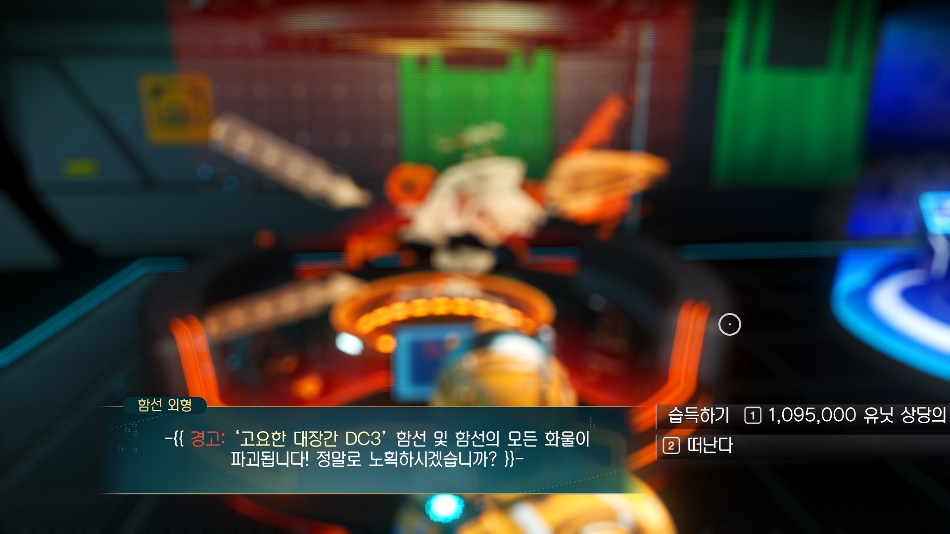 함선 외형, 즉 함선 업그레이드 하고 분해 하는 곳에 간다. 1,56,500유닛에 사서 1,095,000 유닛 상당의 고물을 습득하기, 즉 함선을 녹이는걸 선택한다. 47만 유닛의 손해를 보겠지만....