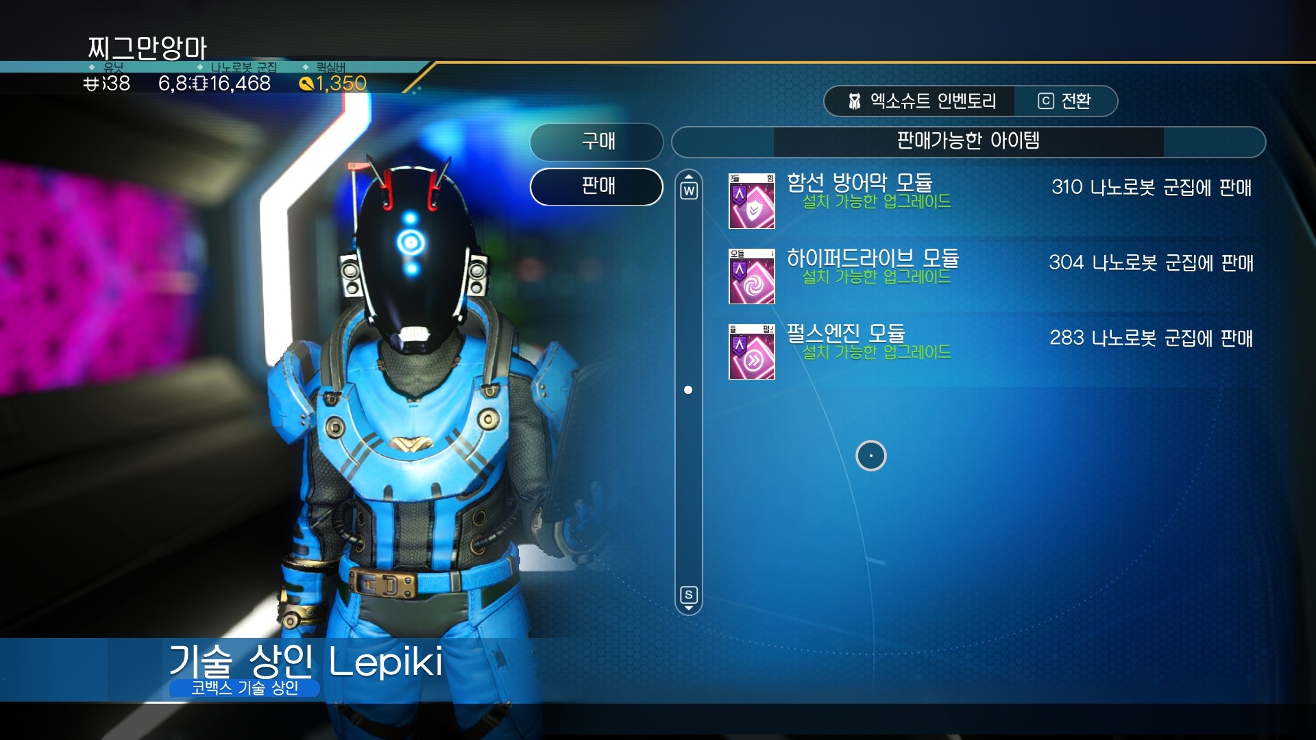함선 모듈의 경우 옆에 모듈 상인에게 말걸고 판매 하면 팔 수 있어 나노로봇 노가다도 자연적으로 하게 된다. 그외 잡다한 아이템들은 바로 뒤 고물상 취급하는 곳에 다 팔아 넘기면 된다.