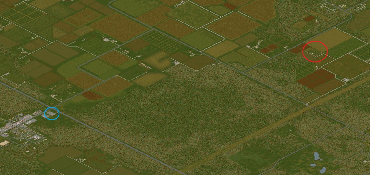 빨간원이 농가, 파란원이 주유소. 로즈우드 주유소와도 거리가 상당히 가깝지만 도로를 통해 가야 한다면 멀드로우로 가는 길을 가야 하기에 조금 멀다고 볼 수 있다. 밭으로 바로 간다면 로즈우드도 상당히 가까워진다. 로즈우드 주유소를 애용하고 싶다면 밭에다가 길을 까는걸 추천한다.