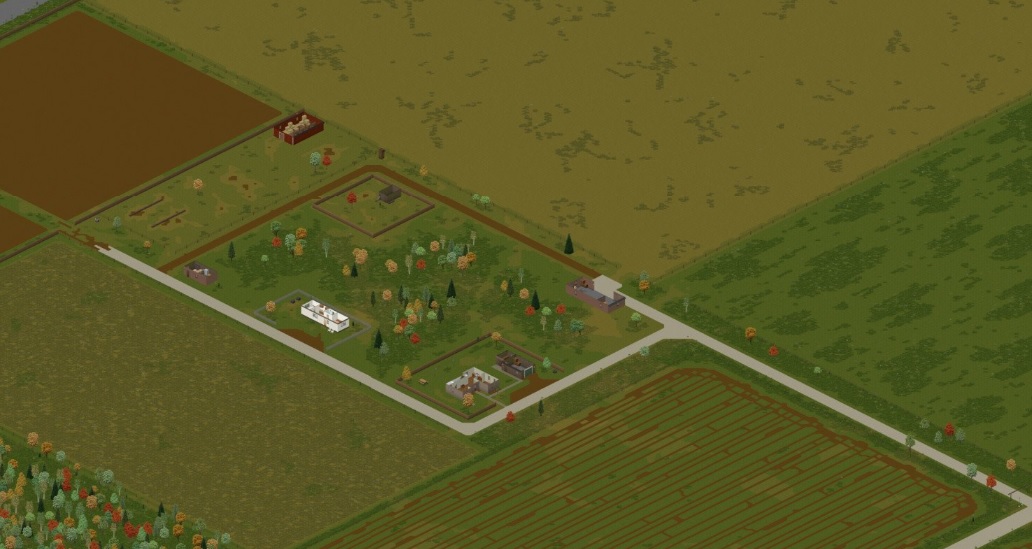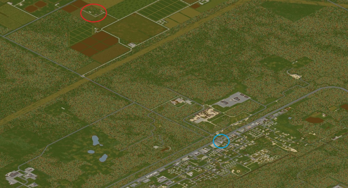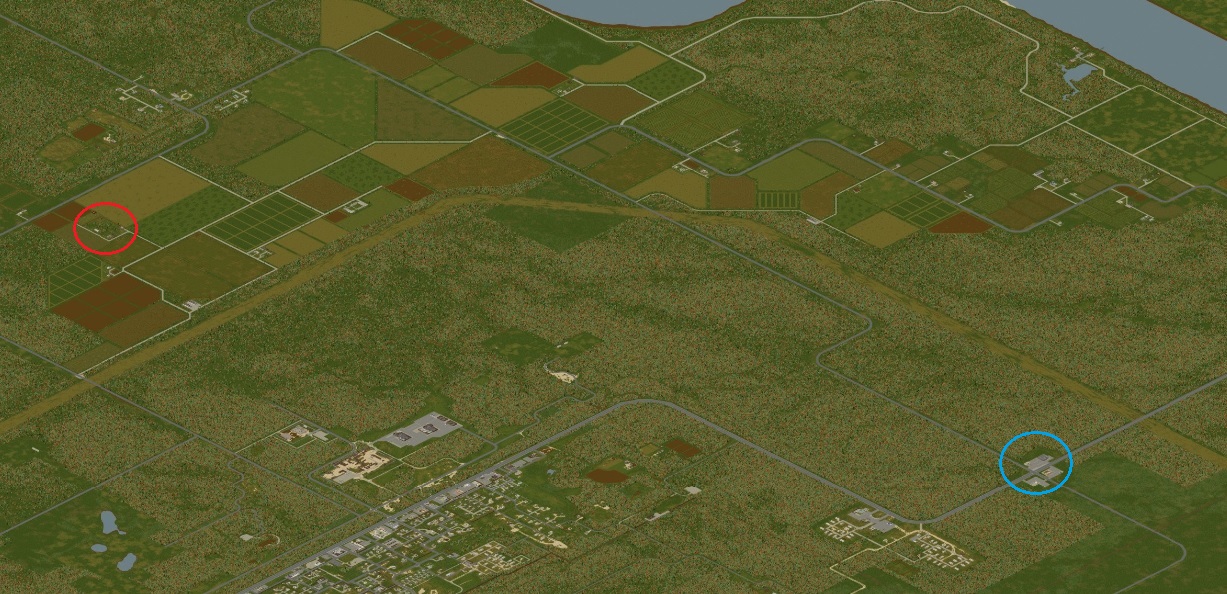 빨간원이 농가, 파란원이 주유소다. 거리가 꽤 멀긴 하지만 차를 타고 가는 길엔 좀비가 없어서 안전하게 갈 수 있다는 장점이 있다. 특히나 도시쪽 주유소의 좀비가 너무 많아 처치하기 곤란하다 싶을때는 오히려 저기가 더 나을지도 모른다. 외딴 곳에 떨어져 있다보니 도심에 비해서는 좀비도 좀 적은 편이다. 북쪽 도로를 따라 가야 하고 거리가 상당하기에 차가 필수다.