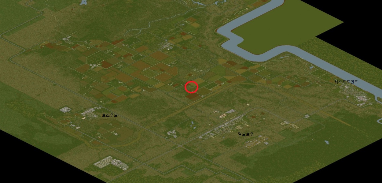 전체 지도를 보면 빨간원이 바로 이 농가다. 동쪽으로는 멀드로우가 있다. 사실상 거리가 가장 가까우면 뛰어서도 진입이 가능하다. 북쪽으로 난 도로를 따라 가다가 몇몇 집으로 가는 작은 도로를 통하면 웨스트 포인트도 갈 수 있다. 로즈우드도 역시 진입이 가능한데 멀드로우 가는 큰 도로에서 로즈우드 방향으로 쭉 가는 도로가 있기 때문에 차만 있다면 로즈우드 주유소 있는 곳으로 바로 진입이 가능하다. 그렇다보니 이곳에 오는 것도 그리 어려운 일도 아니다.
