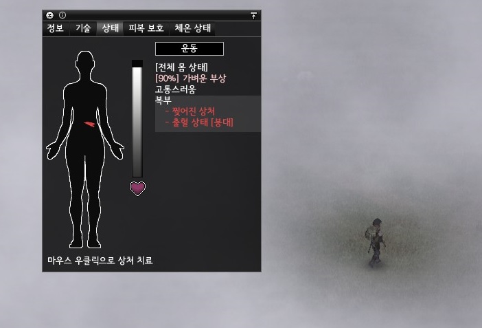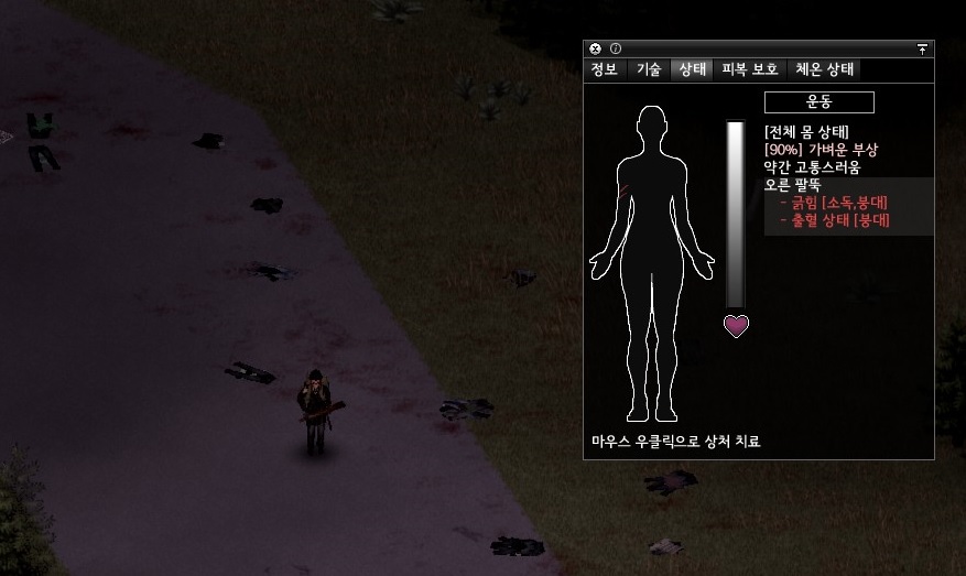 하지만 실수였다. 좀비들이 어디서 왔는지 모르겠지만 잔뜩 포진해 있었던것.. 결국 도망치다가 이렇게 복부에 또 상처를 입었다. 이번엔 상처가 꽤나 큰 모양이다. 고통이 어마어마하다. 보통 상처 한군데 나면 붕대를 감으면 고통이 10정도인데 붕대를 감아도 25정도의 통증이 느껴진다. 솔직히 이번에는 글렀다고 생각했다. 표백제를 찾으러 가야 할 것 같았다.