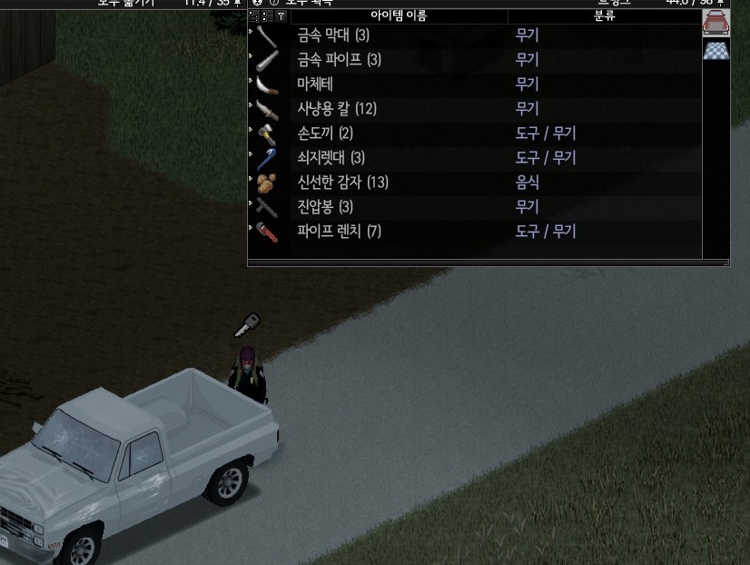 판자로 좀비를 잡는건 무난했다. 하지만 워낙에 잘 부서지다보니 1~2마리씩 유인해서 눕힌뒤 뚝배기 방식의 전투로 진행했다. 하지만 문제가 너무 느리다는 것이다. 멀드로우에 가까워질수록 좀비는 많아지고 하나둘 불러서 잡는데는 한계가 보이기 시작했다. 무게도 3이기 때문에 많이 들고 다니지도 못했다. 혹시나 중간에 부서지면 바로 다음 판자를 쓰기위에 착용+등뒤 부착을 하다보니 무게 게이지도 엄청났다.