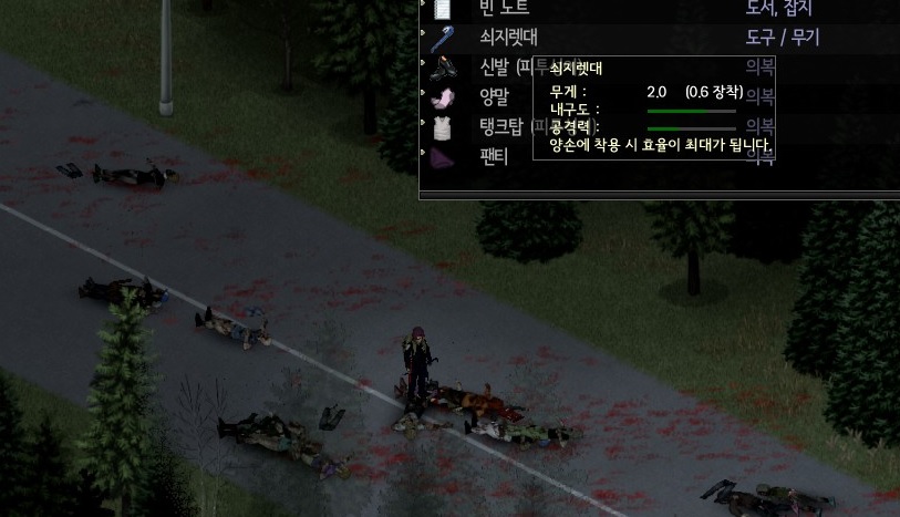 숲속에 숨어있던 녀석들을 하나둘 불러서 때려 눕히던 중에 한 녀석이 쇠지렛대를 달고 나타났다. 때려 눕히고 내구도를 확인하니.. 오옷... 이 정도면 오래 쓰겠는데.. 아까 줏은것으로 좀비를 이렇게 많이 눕혔는데도 이제 절반 조금 밑으로 내려갔다. 하여튼 이거 물건이네..; 하지만 3일차도 여기까지.. 날이 어두워지기 시작했다. 돌아가는 길에 숲길에서 튀어나오는 좀비 몇을 처리해야 했다.