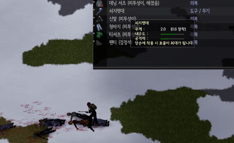 찢어진 천으로 수선하고 덧대었더니... 이렇게 되어버렸다. 그래도 좀비에게 당하는 것보다는 낫지. 그나저나 날씨가 점점 따뜻해지니 겨울옷을 입고 조금만 뛰어도 땀이 찬다. 이제 옷을 좀 가볍게 입어야 할 때인가 보다.