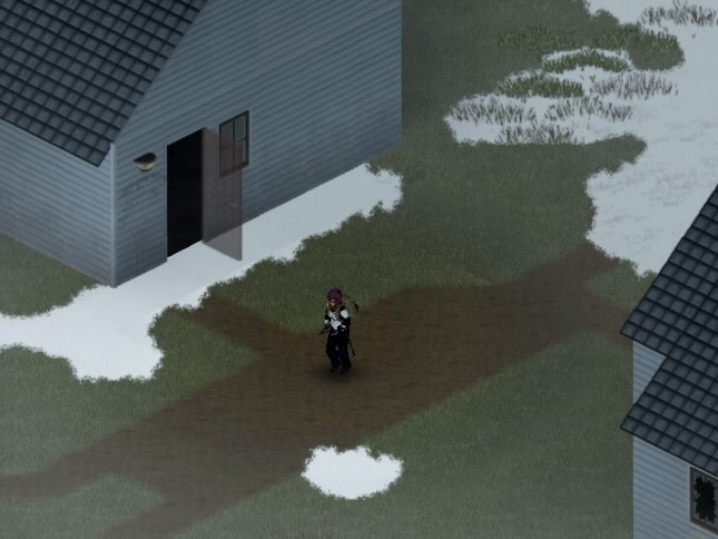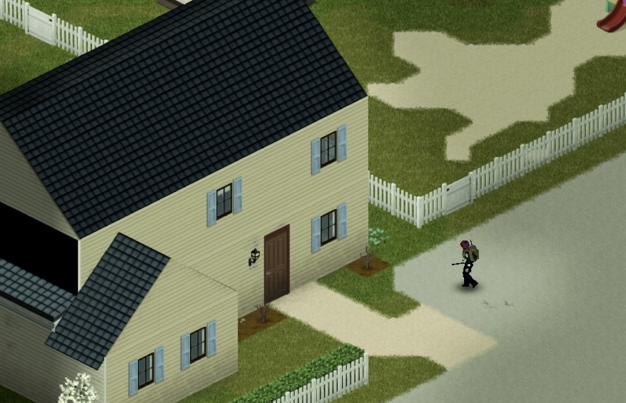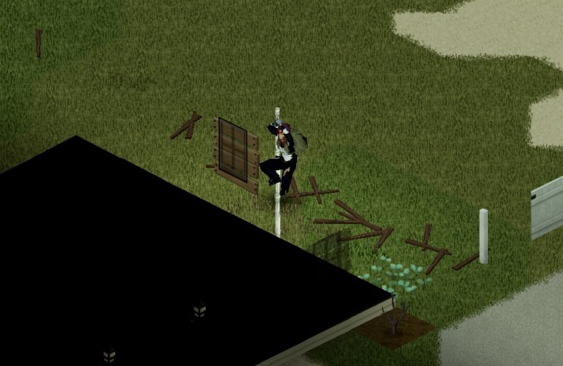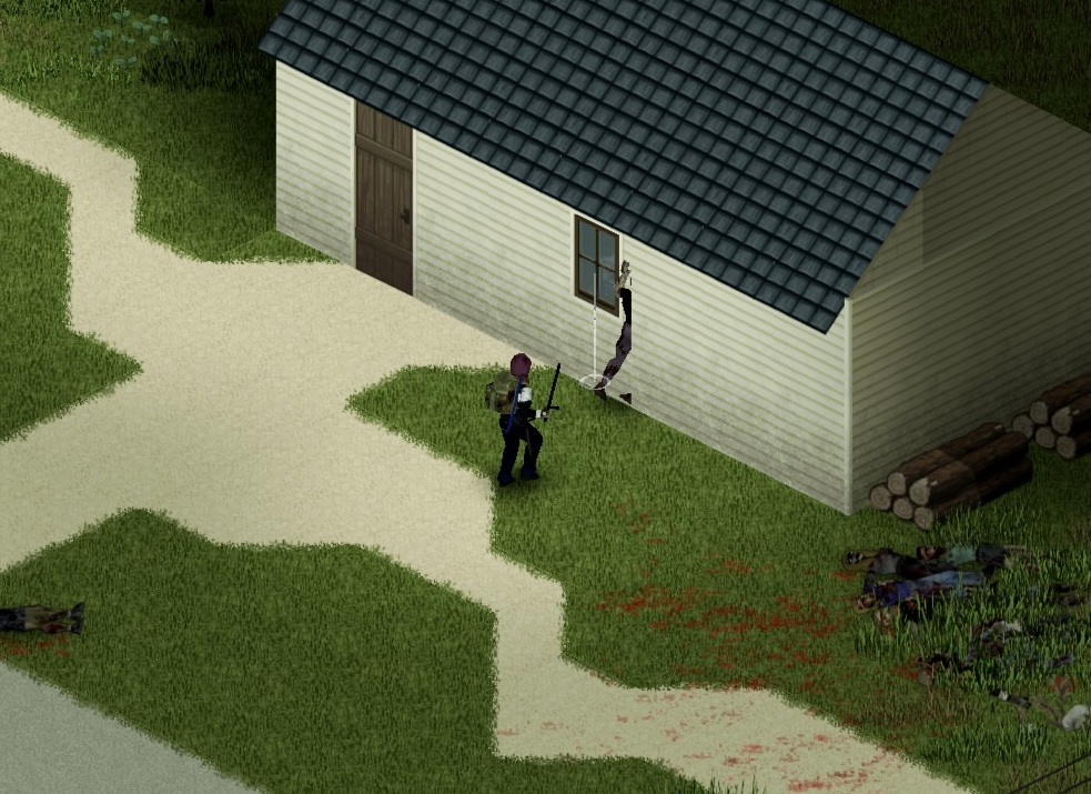 드디어 도착한 전진기지 집 앞마당.. 좀비를 다 때려 눕혔는데도 이상한 소리가 나서보니..;; 낑겨서 못 나오는 모양이다. 근처에 가도 계속 저러고 있다. 뒤에서 후두려 패니 그때서야 밖으로 튀어나온다. 밟아주자.