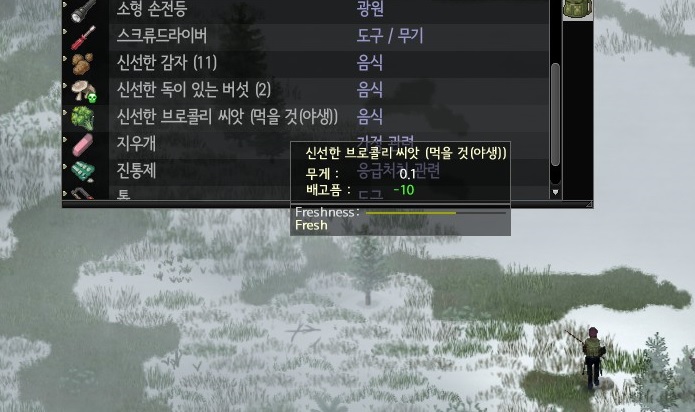 채집으로 씨앗도 구할 수 있구나 했는데.. 씨앗과 함께 먹을 수 있는 것도 나온다. 포만감 -10이라니.. 생각도 높은데? 요리는 안되고 그냥 먹어야 되는 것 같다.