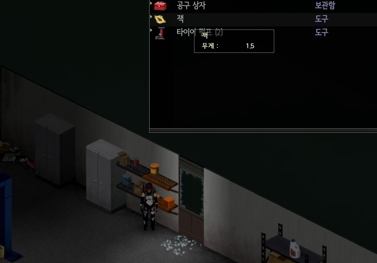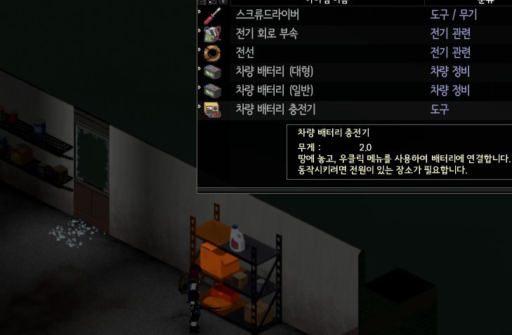 차량 정비소인데 잭이 꼴랑 한개 있다니.. 너무 하네..; 배터리 대형, 일반 챙기고, 충전기도 하나 챙겼다. 일단 차에 맡겨놓고 다시 내려오기로 하고 기지로 다시 복귀.