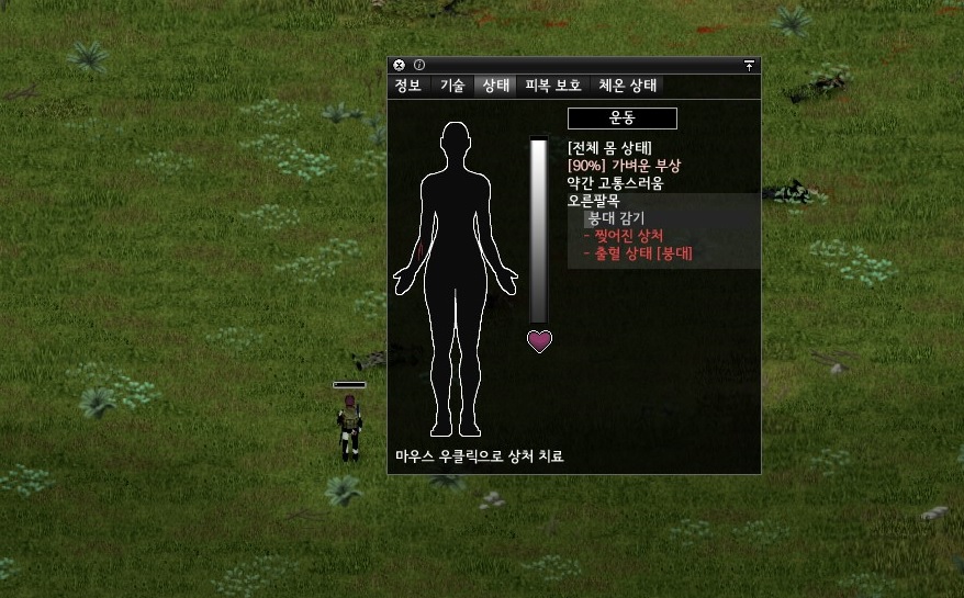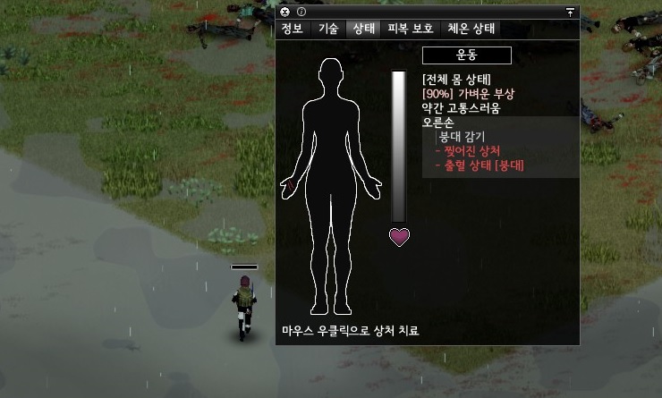 이상하게 여기 좀비는 뭉쳐있지 않고 퍼져 있다보니 유인할때 신경써야 할 방향이 너무 넓었다. 결국 한 놈이 다가오는 것을 못 보고, 이렇게 또 땅했다. 아흑..; 아마 나무뒤쪽에서 좀비 죽는 소리 듣고 왔던 모양이다. 젠장.. 다행히 좀비화는 진행되지 않았지만 공격속도가 느려지는 바람에 결국 후퇴해야 했다.
