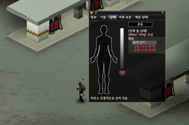 주유소에 몇마리 안되는 좀비는 때려잡자 해서 내려갔다가 방심한 틈에 또 찢겼다. 아..;; 전투할때 멀리 본다고 줌 아웃을 너무 심하게 해서 그런가.. 자꾸 엉뚱한방향으로 밀기 하다가 뜯긴다니깐..;;