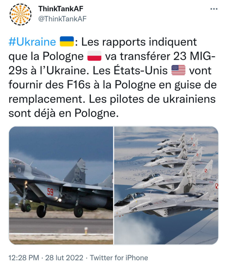 현재 폴란드가 미그-29 23대를 우크라이나에게 보낸다, 공군기지를 대여했다,는 말이 나오고 있지만 아직 확실하게 나온게 없는 상황입니다. 미그-29보내고 F-16받을거라는 말도 나오고요.