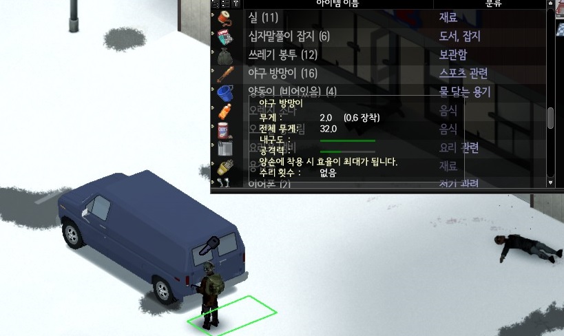 프로젝트 좀보이드에서 긴 둔기로 가장 튼튼한 것은 '쇠지렛대'이고 가장 범용적으로 사용 가능한 것은 바로 '야구 방망이'다.