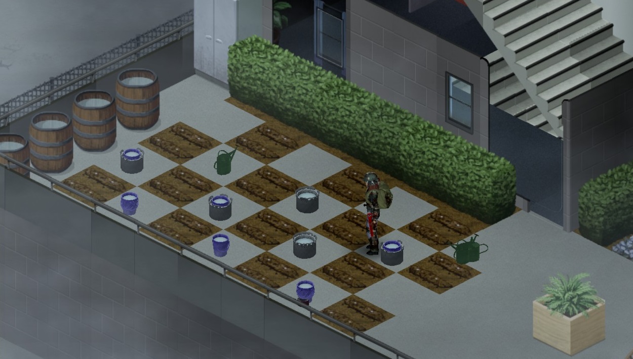 베란다와 이어지고, 2층 계단과 연결된 이 곳이 감자 밭... 빗물받이 통을 설치 했지만 파밍중에 가져온 손잡이 냄비, 양동이, 요리용 냄비를 바닥에 놔뒀다. 물을 구하러 가는게 생각보다 귀찮다보니 이렇게 도배를 해 버렸다. 저기 깔린 양동이와 요리용 냄비가 각각 30개는 족히 되지 싶다. 손잡이 냄비는 옥상에 있다..; 그건 아마 50개 넘어갔을듯..ㅋㅋㅋ
