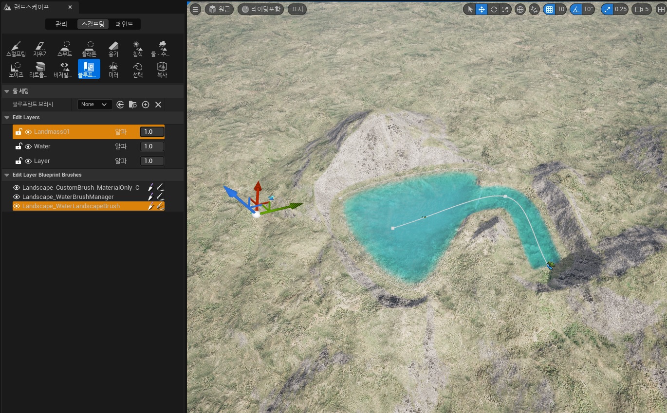 랜드스케이프 레이어로 가서 블루프린트 브러쉬에서 WaterBrushManger와 WaterLandscapeBrush 두개를 Landmss가 있는 레이어에 배치해주자. (선택 후 에디터에 클릭하면 배치가된다.)