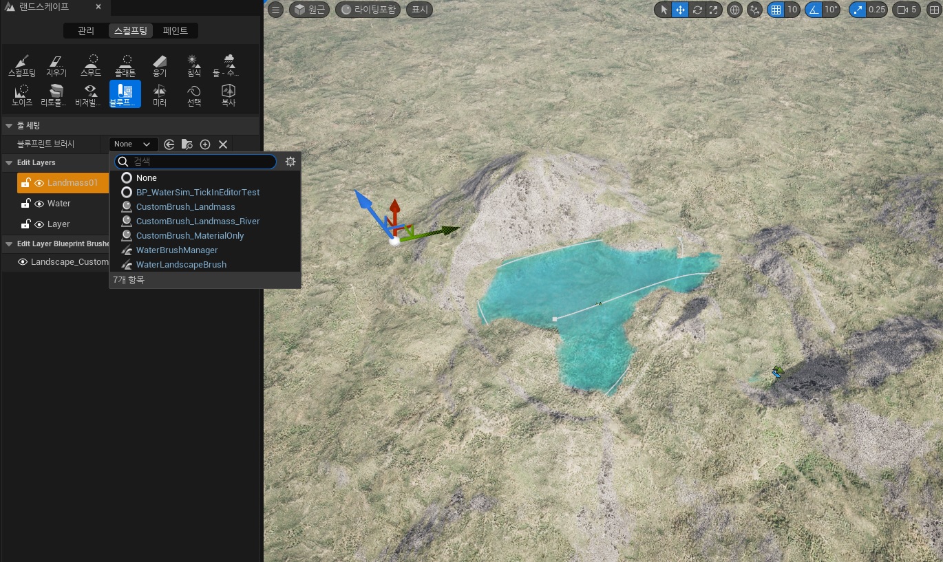 3.바로 밑에 툴 세팅에서 CustomBrush_Landmass, CustomBrush_Landmass_River, CustomBrush_MaterialOnly 중에 선택하고 에디터에 클릭하면 적용된다.