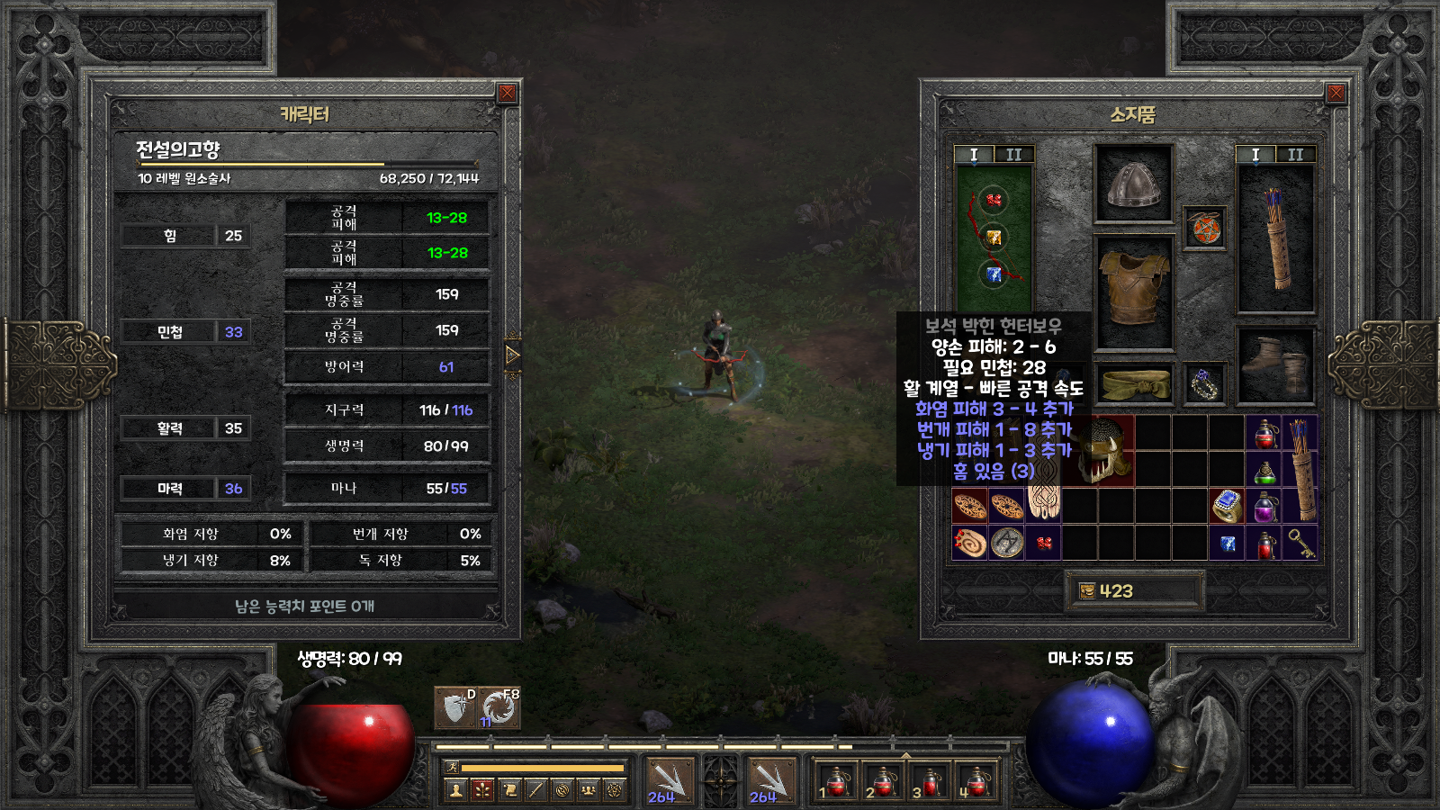 물론 초반에는 참 힘들다. 기술로 몹을 잡는다는 것은 힘들다 보니, 이렇게 3솟 활에 보석을 박고 활소서로 시작한다.