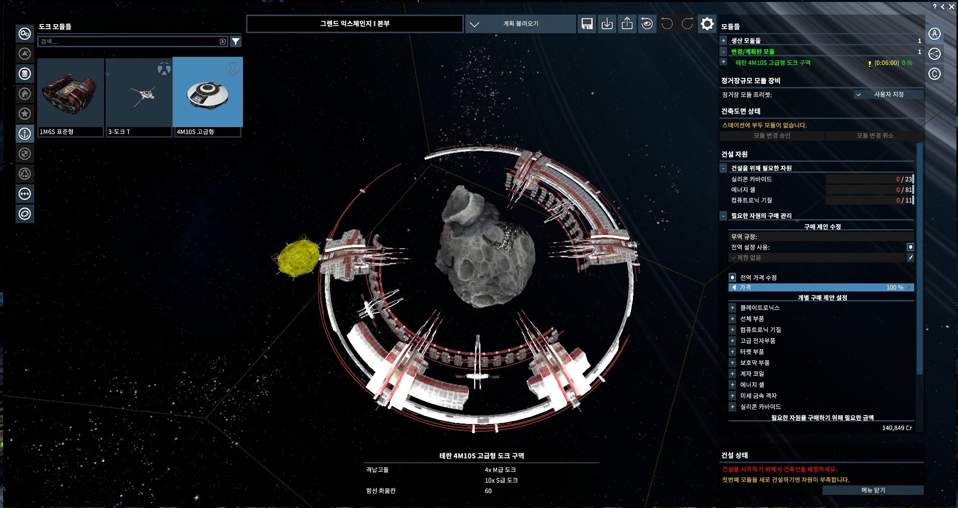 모듈을 연결하고 '승인'을 하게 되면 건설에 필요한 자재를 구입해야 되는데 아래쪽에 자재 구입에 필요한 '추산 수락'을 클릭하게 되면 해당 재료의 구입 비용을 자동으로 할당한다. 건축 재료와 스테이션 운용 재료는 다르니 구분해야 한다.