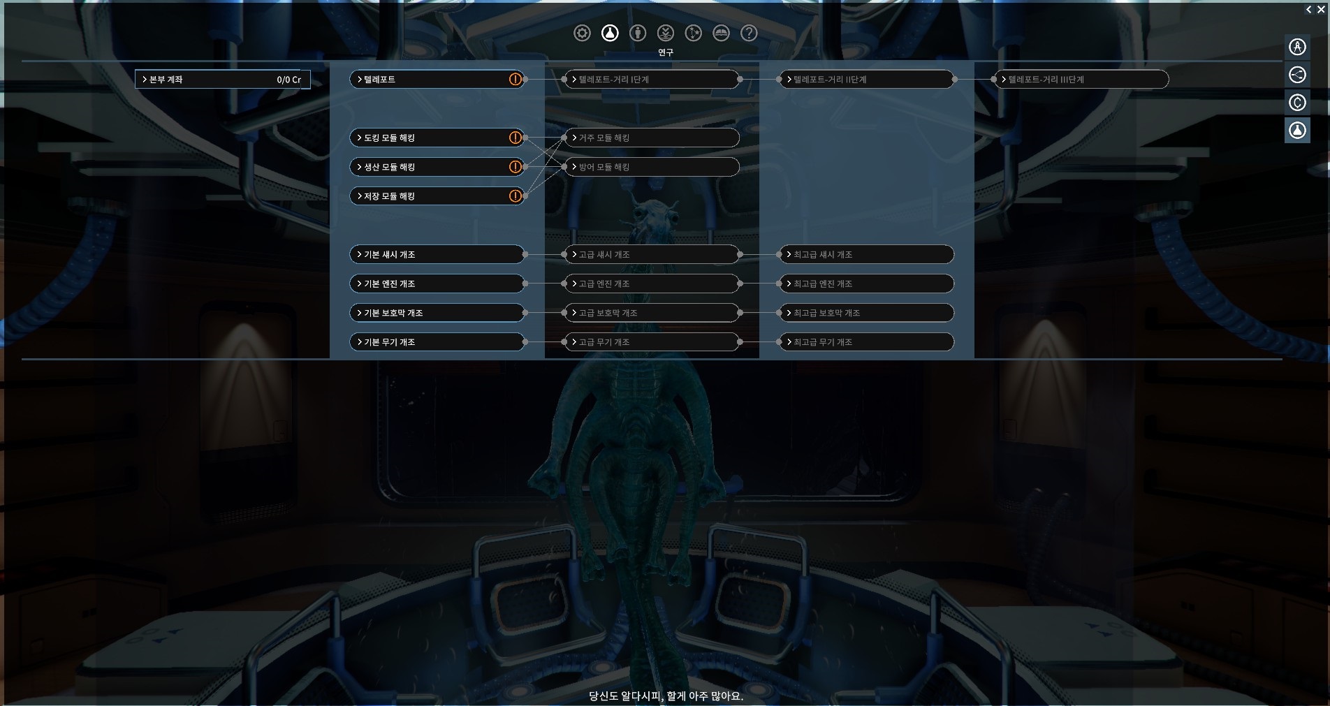 대화를 끝내고 나면 이제 '연구'탭이 개방된다. 먼저 추천하는 연구는 바로 '텔레포트'. 클릭하면 필요한 자원과 시간이 나오고 그 아래에 '연구 시작' 버튼이 있는데 이걸 클릭하면 재료가 모였을때 연구를 시작하게 된다.