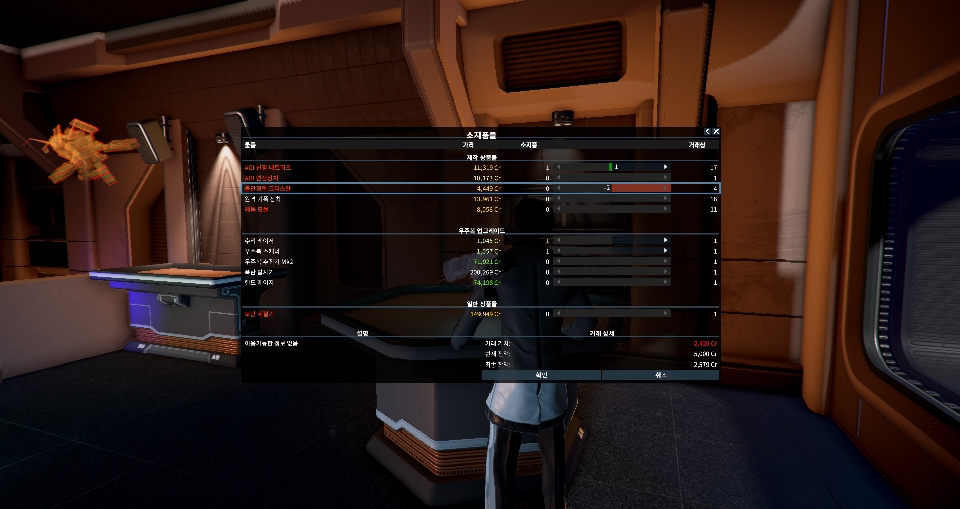 스테이션에 착륙 후 엘리베이터에서 바였던가..유흥가였던가.. 하여튼 거기로 가면 다나카가 있고 말을 걸면 구매가 가능하다. 히엑.. 1만cr이 넘네.. 다행히 불안정한 크리스탈이 있어서 그거 팔고나니 살 돈이 나온다. 그래서 일부러 2개 쥐어준 거였구만..; (이 스샷은 잘 못 샀던 순간을 찍은거다. 다시 원가에 되팔고 제대로 구매)