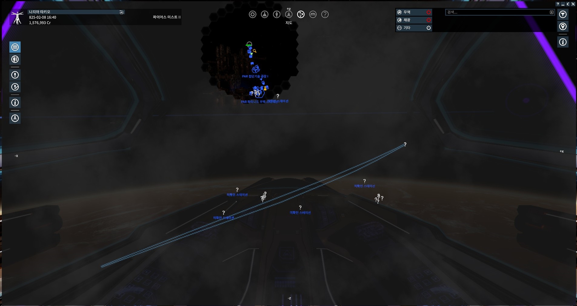 장거리 스캔을 하고 나면 이렇게 지도에 '?'들이 나타나기 시작합니다. 여기서 '미확인 스테이션'은 말 그대로 스테이션이며, '미확인 물체'들은 인공위성, 터렛, 게이트, 가속기 등입니다. 적(우호도 -30)일 경우에도 이렇게 그냥 ?표로 나오기 때문에 적진에서는 스테이션을 피해 갈 수가 있습니다.