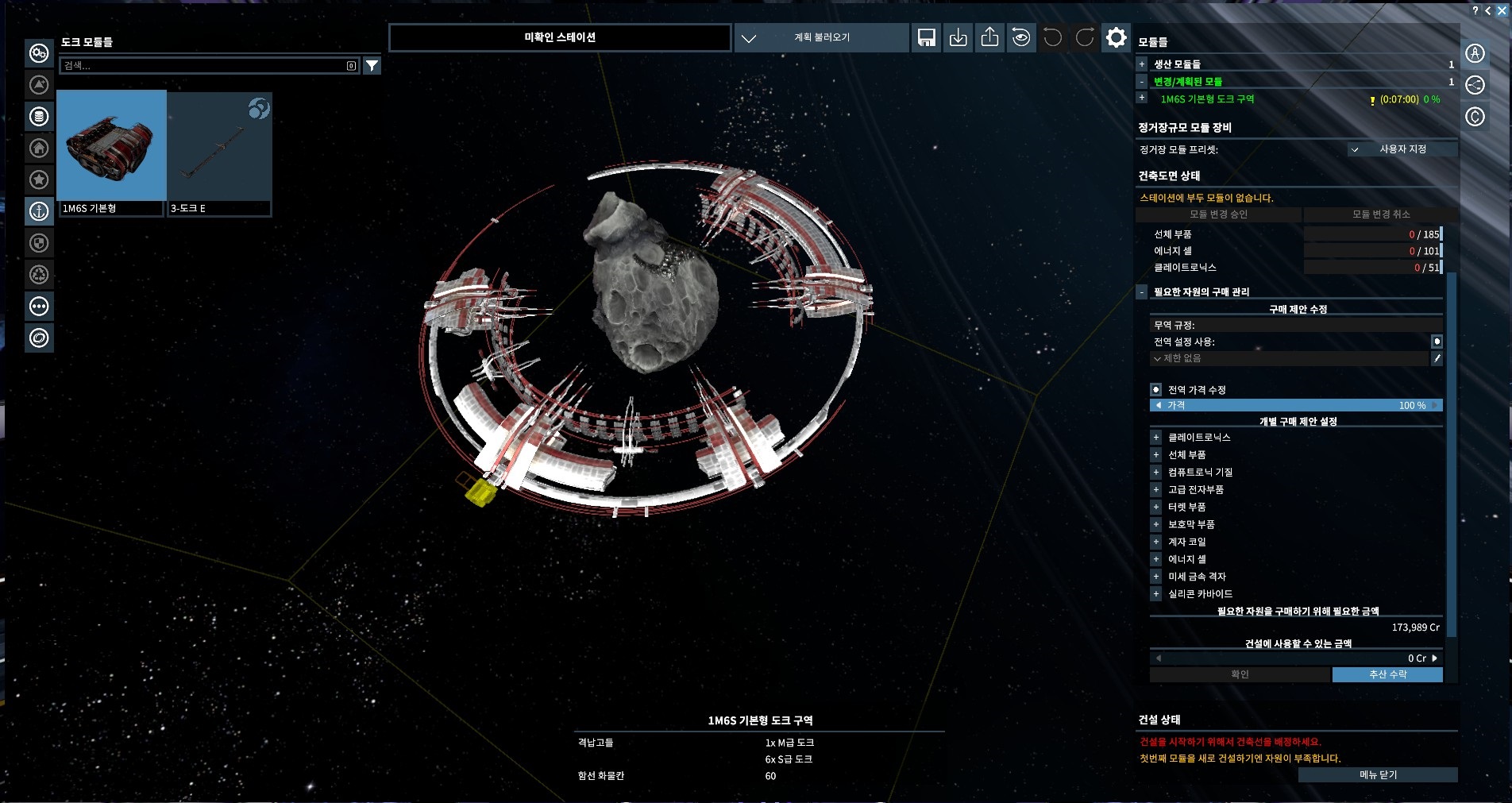 이제 도크를 건설 해야 합니다. 스테이션 클릭 -> 정보창에서 스테이션 수정 클릭 하면 건축 화면이 나옵니다. 도크 모듈을 연결하면 필요한 재료들이 위에 표시됩니다. 밑에 '추산 수락'을 해주면 다른 세력들이 필요한 재료를 사서 팔아주는데 시간이 걸립니다. 빨리 진행 하고 싶다면 직접 재료를 사서 스테이션에 '거래하기(건축 저장소)'를 하면 됩니다. 타 세력이 자원을 사서 가져 올때는 필요 자원에 (+숫자)가 나오면 하단에 어떤 함선(코드)이 오는지 보이고 앞에 시간이 보입니다. 가끔 몇시간씩 걸리는게 있는데 이때는 취소 하고 다시 기다려주세요.