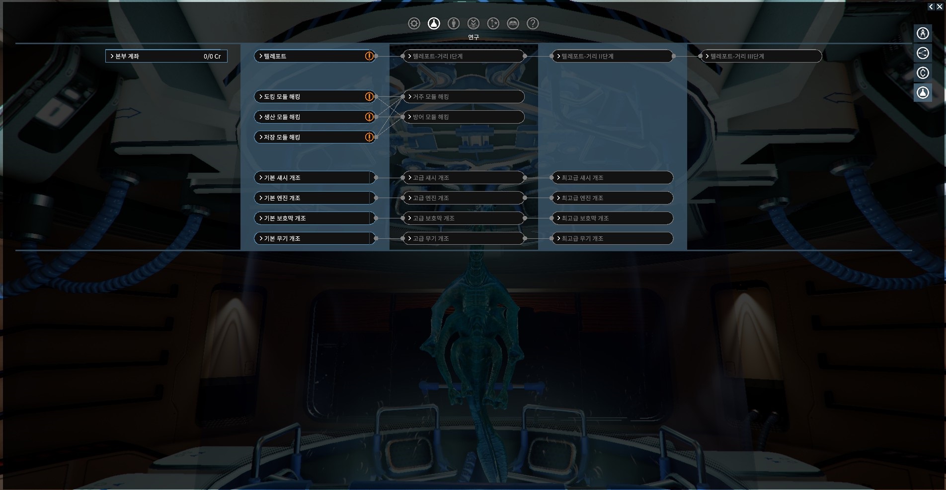 연구 탭으로 들어갑니다. 여러가지 업그레이드가 있으며 어떤걸 먼저 하던 자유입니다만, '텔레포트'를 강력 추천합니다. (보소 타 역시 추천) 이유는 다음 플롯 진행을 수월하게 하기 때문입니다. 이후로도 텔레포트는 전부 다 연구하기를 강력 추천합니다. 3단계까지 완료하게 되면 HQ 스테이션을 텔레포트 할 수 있는 연구가 개방 됩니다. (하지만 필요 재료가 어마어마 하다는...)