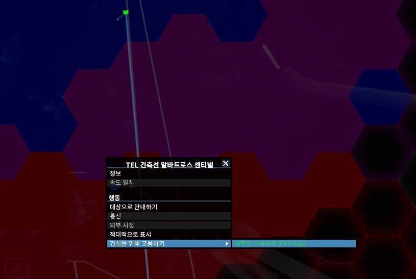 재료가 다 모였다면 이제 건축선을 배정해야 됩니다. 건축선은 주로 게이트 웨이 근방에서 어물쩡 거리는 경우가 많습니다. 운 좋게도 재료 사러갔다가 어딘가로 바삐가는 건축선을 발견 했군요. 아무것도 선택하지 않은 상태에서(지도 아무곳이나 클릭) 건축선 우클릭하면 '건설을 위해 고용하기'가 뜹니다. 건설 예벙이 스테이션 이름이 나옵니다. 지금은 한개 뿐이라 한개만 나오지만 만약 여러개가 건설 중이라면 그 리스트가 다 나옵니다. 50,000cr을 주고 고용하면 알아서 갑니다. (생각보다 느려요)
