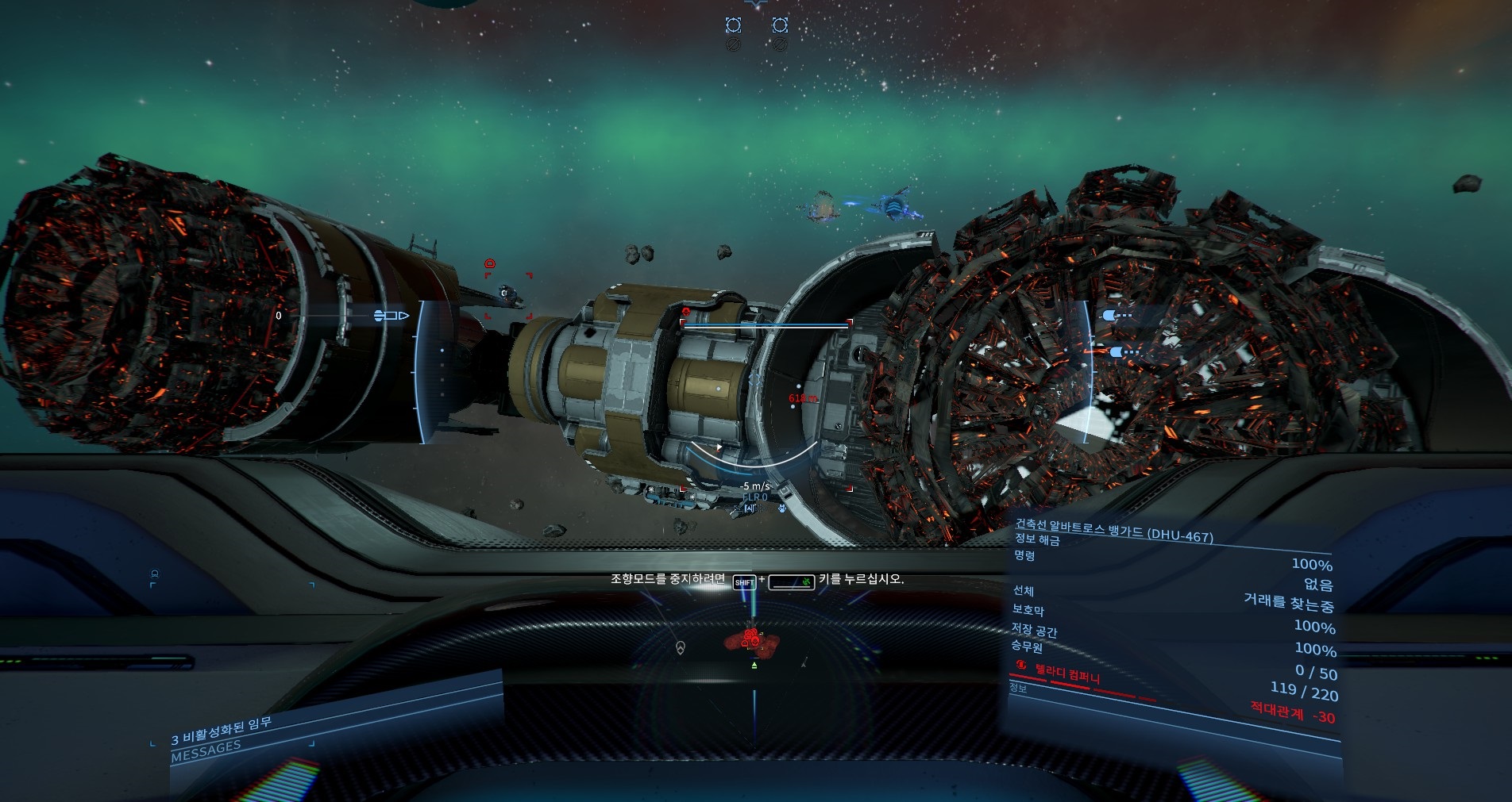 여기는 적군이 자주 나타나는 곳이라(특히 제논), 내려서 양쪽 엔진을 대충 50% 정도만 수리하고 집으로 출발했다. 데리고 가서 마저 수리하는게 안전하니깐.