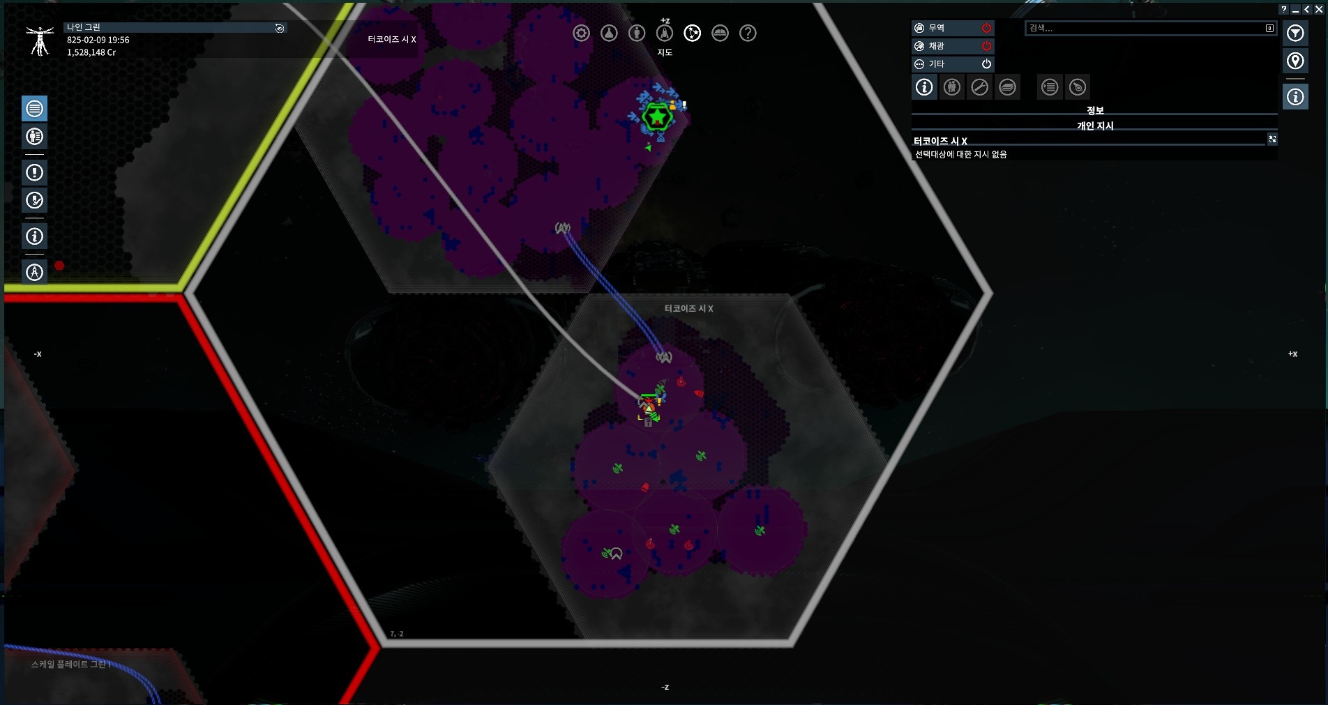 내 기지가 있는 섹터로 넘어 올려면 소유자가 없는 섹터 하나를 더 거쳐야 한다. 여기도 내 기지가 있는 곳과 마찬가지로 자원이 풍부하다보니 광물, 가스 캐는 채광선들이 자주 온다..