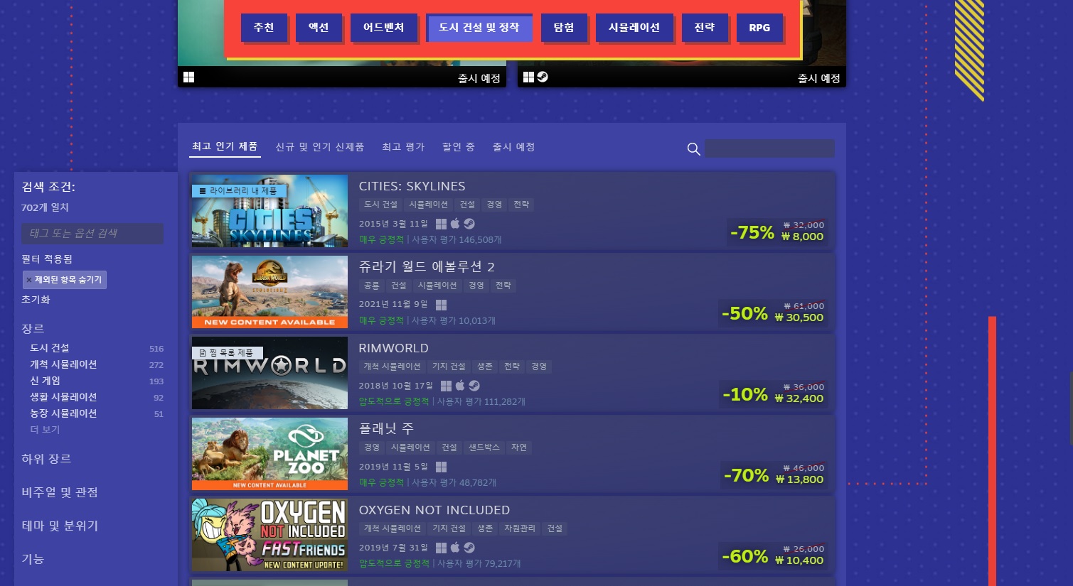 게임 찾기 들어가면 해당 주제로 들어가게 되고 밑에 내리면 이렇게 게임 리스트가 나오는 곳이 있는데 '최고평가' 클릭 한 후에 밑으로 내리면서 '더보기'를 계속 눌러 주세요.
