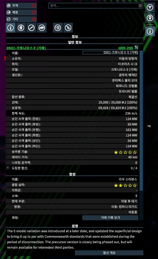 주력 채광선은 크토니오스 E, 일단 기본 속도가 빠르고 순항모드 속도도 빠르다. 그래서 도망가기에도 최적화 되어 있다는 것.. 물론 다굴 치기 시작하면 답 없다..;;