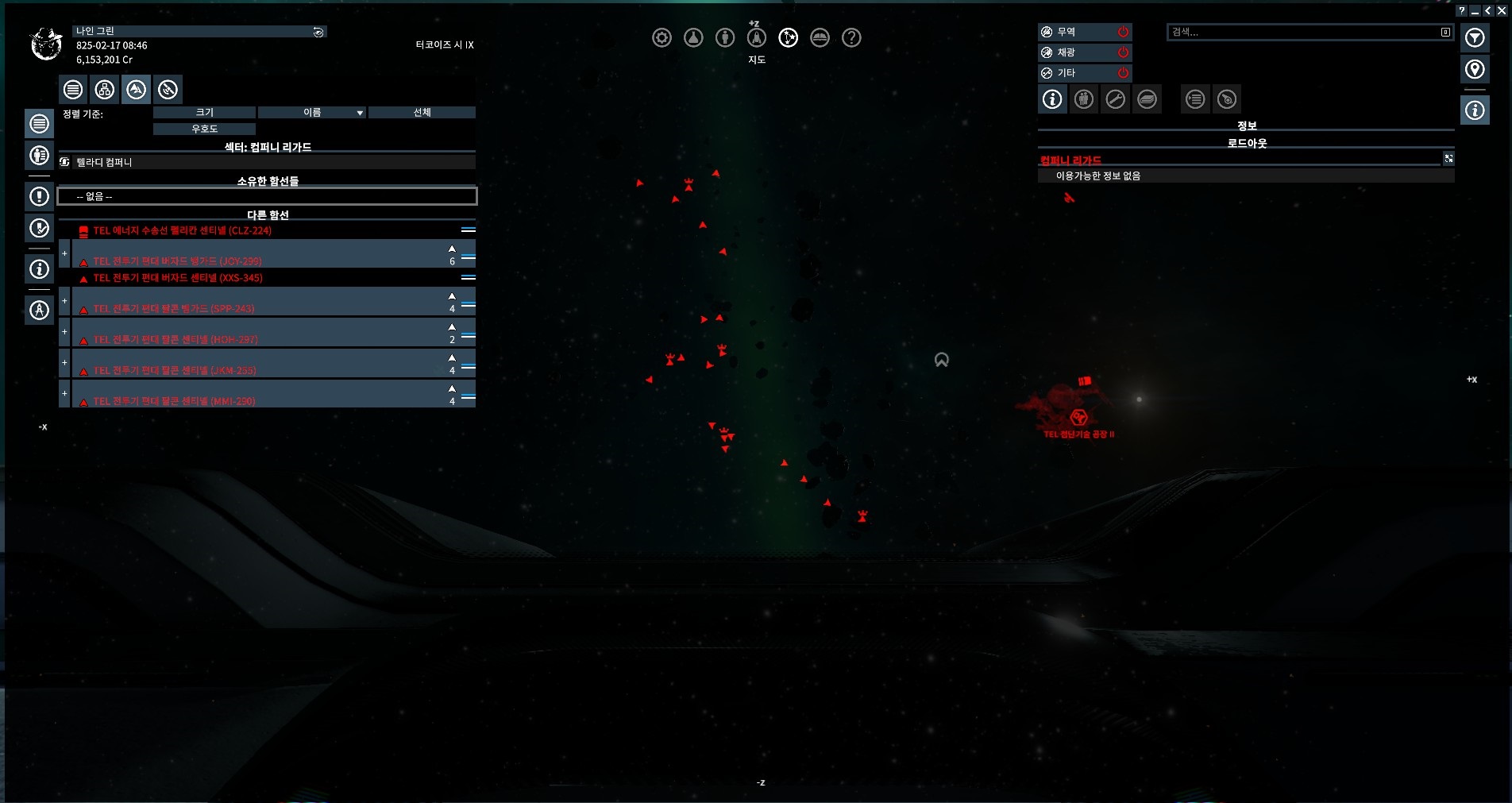 최근들어 제논의 활동량이 늘어나자 컴퍼니 리가드에서도 병력 배치가 늘어나고 있다는 것을 단적으로 보여주는 모습. 보통 전투기가 이렇게 많이 없었는데.. 제논쪽에서 구축함 K가 몇대 돌아다니자 컴퍼니 리가드에서도 구축함과 전투기가 이렇게 떼를 지어 형성되어 있다. 그렇다보니 가스 채굴선을 보낼수가 없다. 순항모드 들어가기전에 계속 맞으니깐..;; 일단 요 녀석들을 좀 때려잡아 준다. 1~2마리 정도야 그냥 상대가 되지만(미사일을 쏜다면 힘들어짐) 3마리가 넘어가면 그때부턴 도망도 쉽지 않으니 최대한 분산시키면서 각개격파를 노려야 된다.