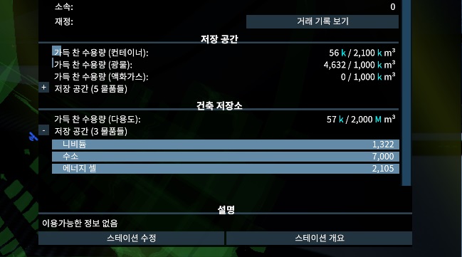 스테이션에는 이런 '건축 저장소'가 다 있다. 광물, 가스의 경우 캐다가 남는게 있다면 이 안에 저장해뒀다가 모자랄때 꺼내 써도 된다.