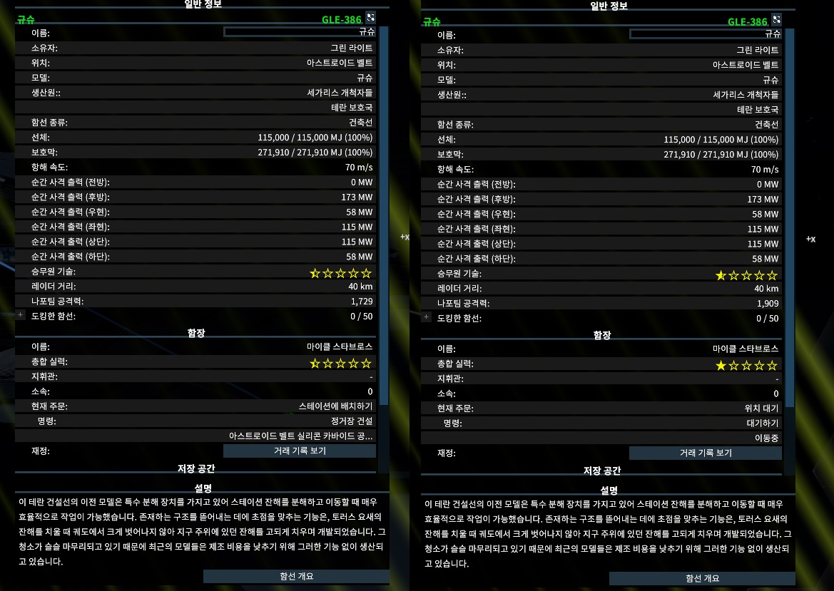 스테이션 모듈 10개+기타모듈10개, 총 20개의 모듈을 건설하고 난 후의 서비스 승무원에서 해병으로 교체한 나포 공격력 차이다. 왼쪽이 건설전 1,729, 오른쪽이 건설 후 1,909. 미묘하긴 하나 차이가 난다.