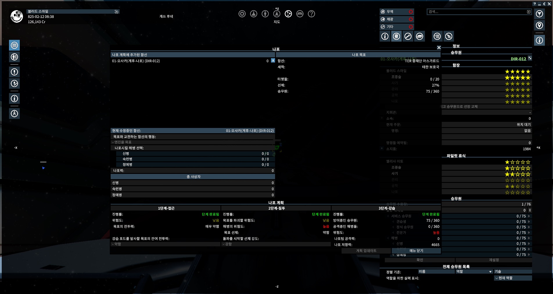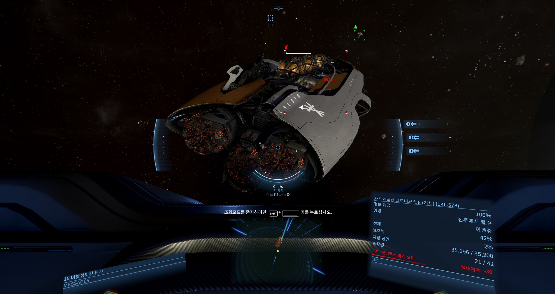 여기 가스 채집선이 한대 있는데...; 일단 승무원이 21명이다. 채광선이야 해병이 약하거나 거의 없기에 이 함선의 최대치 42명을 밀어 넣기만 하면 쉽게 나포는 하지만 예시로 보여주기 위해 채광선을 택했다.