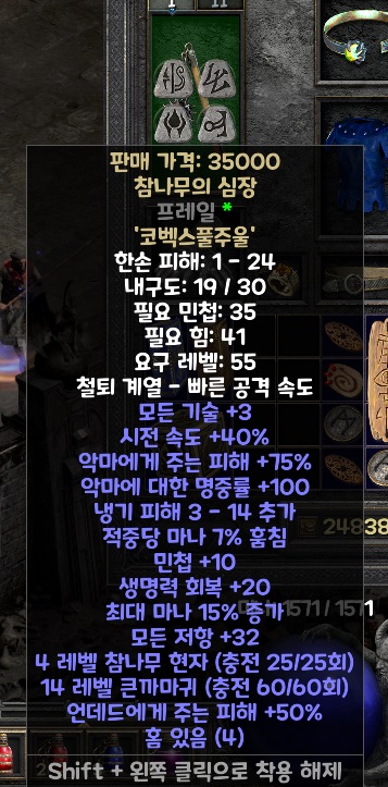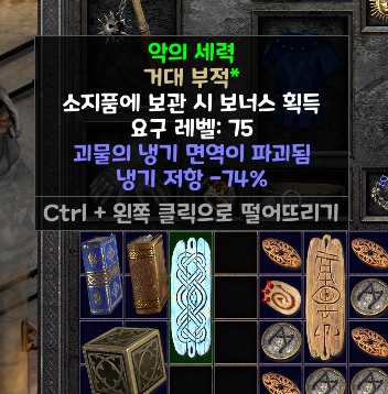 그리고 냉기 파괴참! 저항 -74%로 비교적 양호한것 하나 줏었다. 이거 말고 화염참이랑 냉기참을 한개 더 줏었는데 그건 친구 줘버렸다. 참고로 트리스트람 테러존 걸렸다면 꼭 가자. 거기서 두개나 먹었다. 하여튼 그 이후로 그 곳이 다시 공포영역 걸리길 학수고대 하고 있다.