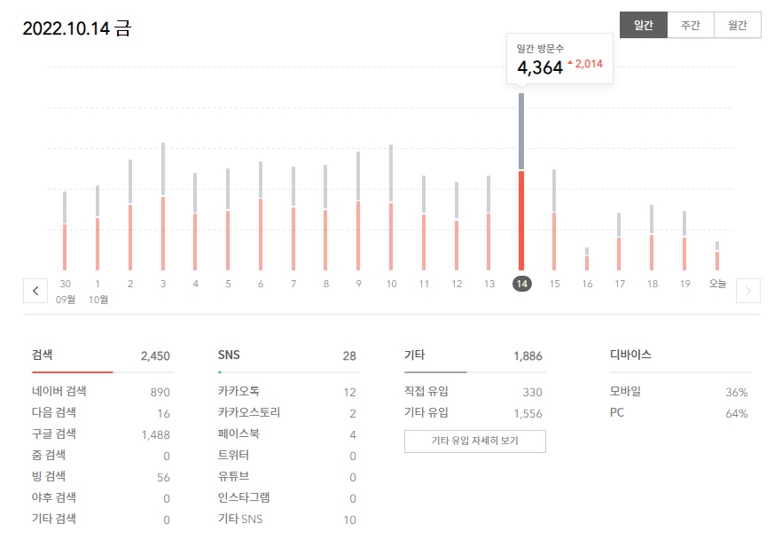 그리고 어제(10월 18일) 날짜로 /m 으로 리디렉션 되는 것도 수정됐지만 이틀동안 방문객 추이와 애드센스 노출 수를 보니...
