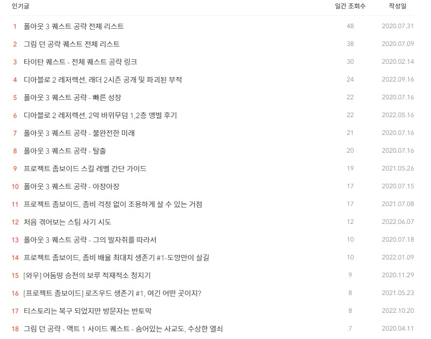 그림 던 공략이나 프로젝트 좀보이드 관련 글이 거의 최고 순위를 차지했는데, 이번에 에픽 게임즈에서 폴아웃 3를 무료로 풀어 버리자 덩달아 폴아웃 3 글들이 대거 인기글로 진입했다.