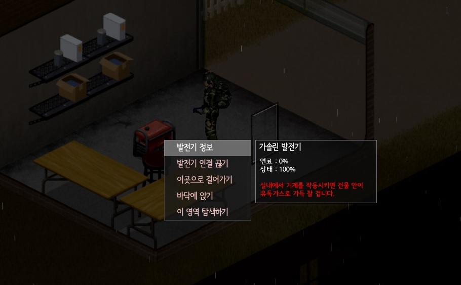 발전기를 실내에서 연결했다면 정보에 유독가스가 가득찬다고 경고하고 있다. 즉, 이 상태로 사용하게 되면 유독가스가 차고, 결국 죽게 된다...; 그러니 반드시 실외에다가 두고 연결하자.