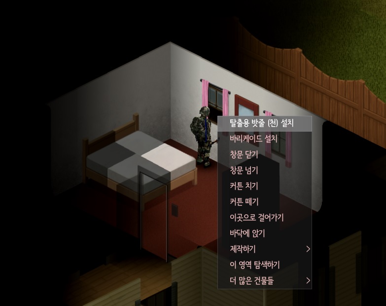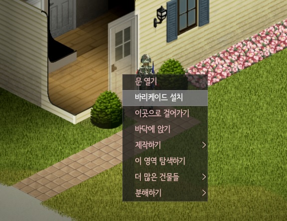 바리케이드를 치기 위해서는 망치, 못, 판자가 필요하다. 이걸 전부 소지품에 가지고 있다면 문이나 창문을 우클릭하면 이렇게 '바리케이드 설치'라는 메뉴가 뜬다.