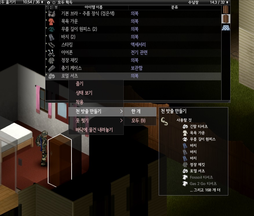1층을 다 막아버리면 출입은 2층으로 해야 하는데, 이럴때 유용한 것이 바로 탈출용 밧줄이다. 데님이나 가죽 의류가 아닌 의류들은 이렇게 우클릭 하면 '천 밧줄 만들기'라는 메뉴가 나온다. 2층이니깐 2개를 만들어야 한다. 만약 밧줄이 있다면 역시 2개로 설치가 가능하다.