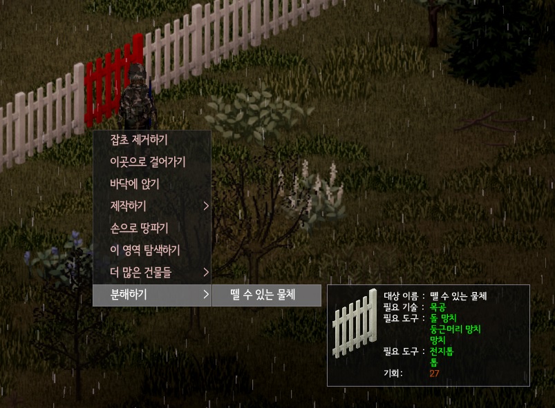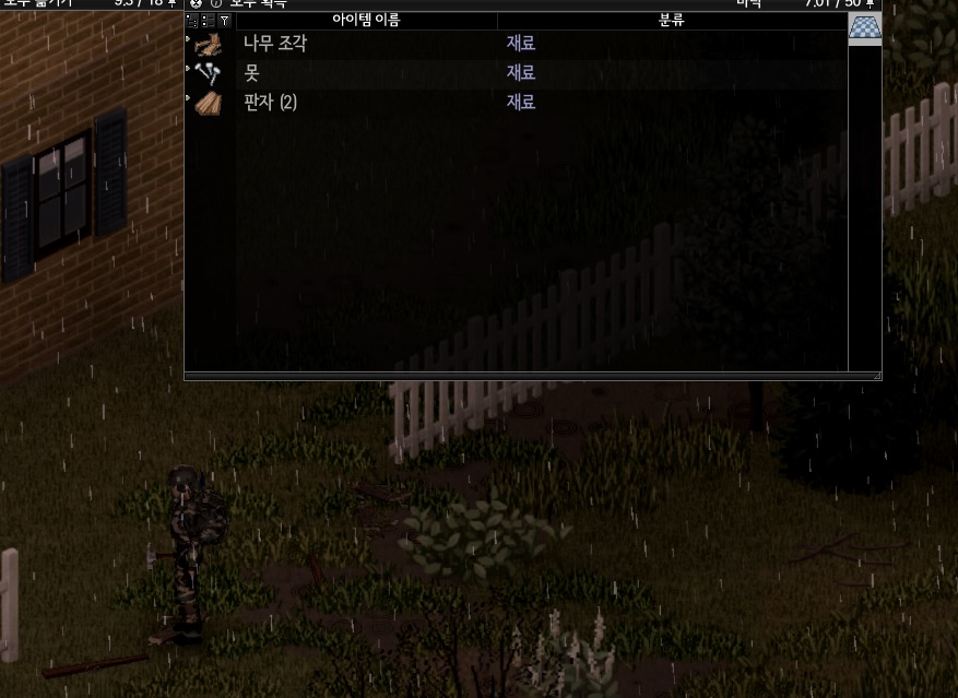 울타리를 분해하면 이렇게 판자와 못을 준다. 못의 경우 목공 레벨이 높다면 더 많이 나온다. 나무조각은 목공 레벨이 낮아 분해에 실패했을때 나오는 부산물이다.